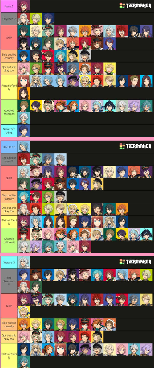Ships: I'm a heavy multishipper with my favs so my favorite ships are basically almost everything that includes Ibara, HiMERU and/or Wataru, very neatly summarized in the tier lists below ↓